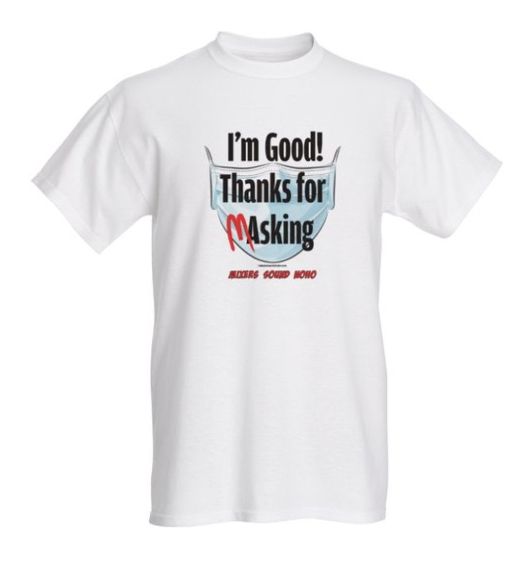 Mixers Sound’s “Thanks for Masking” T-Shirt was created for Mixers Clients and Staff during this COVID crisis. Because of thier popularity we’re offering them to the public with all profits going to charities that support furloughed or unemployed Hollywood production and post artists. That’s around 10 bucks per T-Shirt.